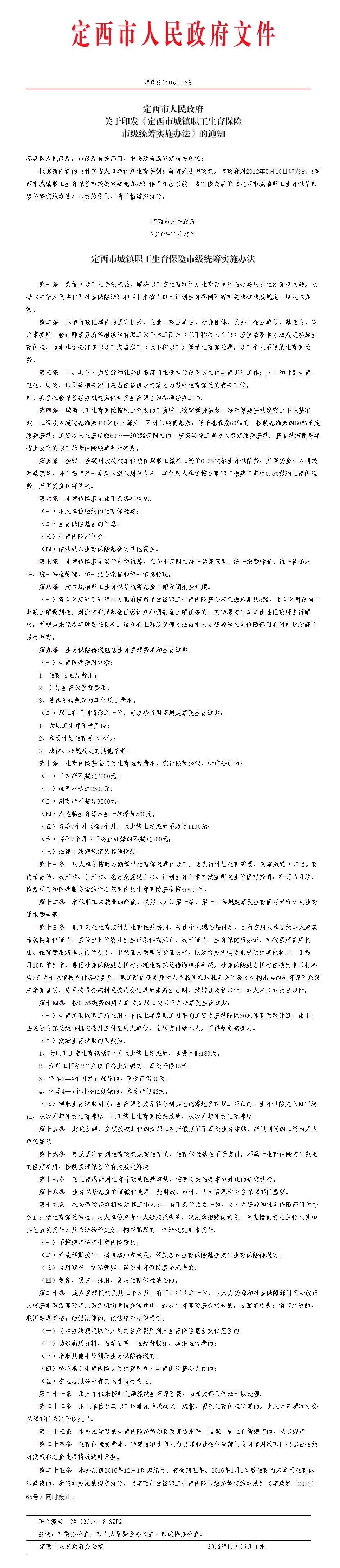 定西市人民政府关于印发《定西市城镇职工生育保险市级统筹实施办法》的通知